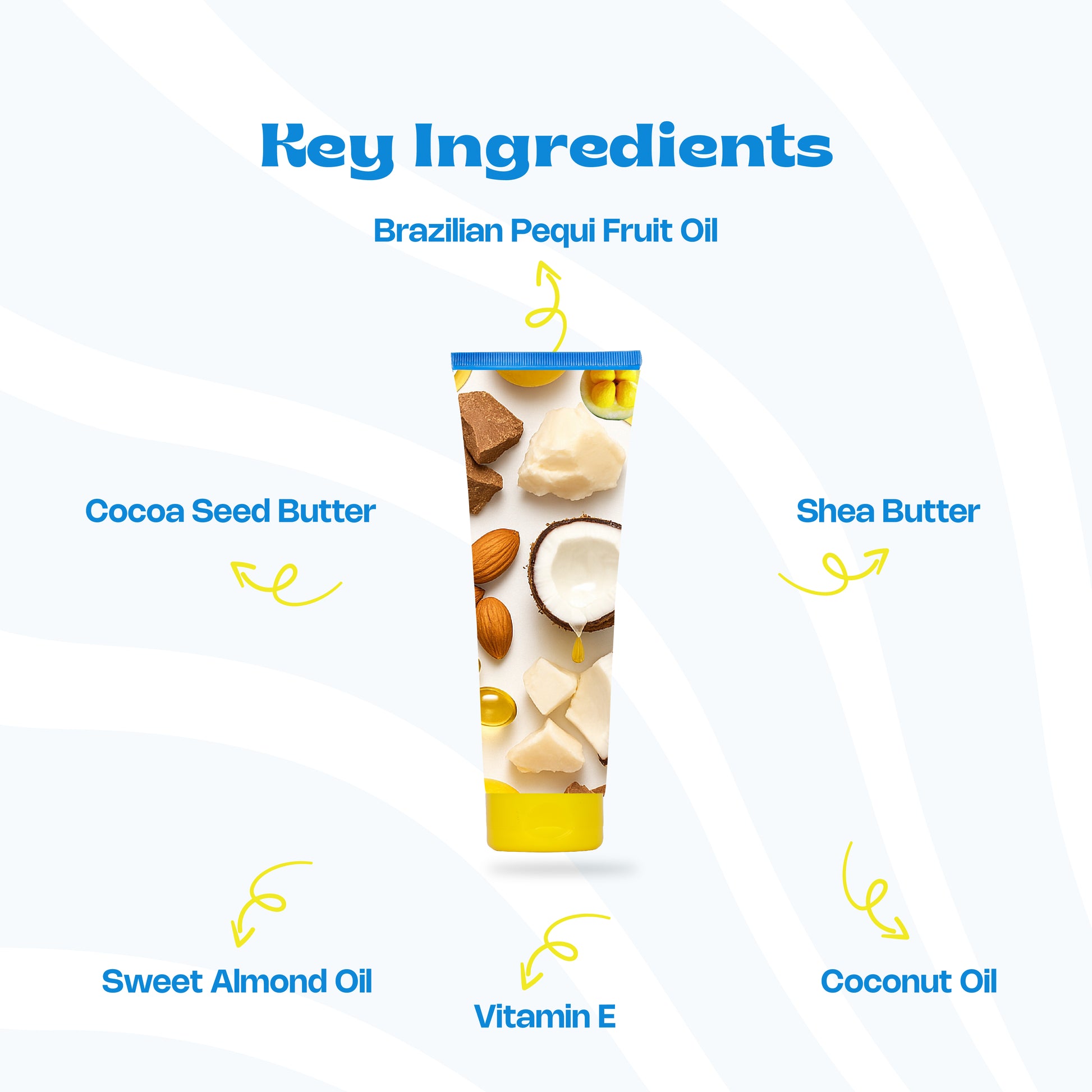 Brazilian Pequi Fruit Oil, Cocoa Seed Butter, Shea Butter, Sweet Almond Oil, Coconut Oil, Vitamin E